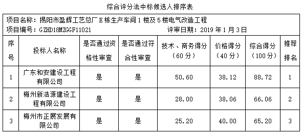 廣州宏達工程顧問集團有限公司(以下簡稱“招標代理機構”)受揭陽市盈輝工藝總廠(以下簡稱“招標人”)的委托,于2019年1月3日就揭陽市盈輝工藝總廠E棟生產車間1樓及5樓電氣改造工程(項目編號GZHD18MZGGF11021)采用公開招標方式進行采購?,F就本次招標的中標結果公告如下: 一、招標人名稱:揭陽市盈輝工藝總廠 二、項目名稱:揭陽市盈輝工藝總廠E棟生產車間1樓及5樓電氣改造工程 三、項目編號:GZHD18MZGGF11021 四、招標方式:公開招標 五、招標項目簡要說明:(包括內容、簡要技術要求、合同履行日期等) 1、項目內容:揭陽市盈輝工藝總廠E棟生產車間1樓及5樓電氣改造工程; 2、簡要技術要求、合同履行日期:詳見招標文件用戶需求。 六、招標公告日期及媒體:招標代理機構于2018年12月10日在公開的媒體廣州宏達工程顧問集團有限公司(http://www.wangtat.com.cn/)、中國采購與招標網(http://www.chinabidding.com.cn/)上發布了招標公告。 七、評審信息: 1、評審日期:2019年1月3日 2、評審地點:梅州市梅江區客都大道東匯城寫字樓D2棟10樓1006號(廣州宏達工程顧問集團有限公司梅州分公司) 3、評標委員會負責人:潘廷 4、評標委員會其他成員:蔡堅、陳志年、朱志勇、鐘輝 八、評審結果詳情如下: ![]() 九、中標信息: 1、中標人名稱:廣東和安建設工程有限公司 2、法人代表:管劍開 3、中標人地址:梅州市梅縣區程江鎮憲梓大道(和安大廈) 4、中標金額(人民幣):伍拾玖萬玖仟捌佰捌拾元零捌分(¥599,880.08) 十、本公告期限1個工作日。 十一、聯系事項: 1、招標人聯系方式 招標人名稱:揭陽市盈輝工藝總廠 招標人地址:廣東省揭陽市揭東區玉窖鎮 2、招標代理機構名稱:廣州宏達工程顧問集團有限公司 招標代理機構聯系地址:梅州市梅江區客都大道東匯城寫字樓D2棟D2-1006號 項目聯系人:卓先生 招標項目聯系電話:0753-2259923 招標代理機構傳真:0753-2251923 此中標公告即為招標結果通知書。如果投標人對此結果有異議的,可以在中標公告發布之日起七個工作日內以書面形式向我公司提出質疑,質疑函中應明確權益受到損害的事實與理由。逾期將依法不予受理。 特此通知! 廣州宏達工程顧問集團有限公司 2019年1月4日 |