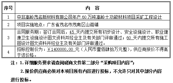 各(潛在)供應商: 廣州宏達工程顧問集團有限公司受中非高嶺茂名新材料有限公司的委托,對中非高嶺茂名新材料有限公司年產60萬噸高嶺土功能材料項目采礦工程設計進行競爭性磋商采購。 一、采購項目編號:MMHD033 二、采購項目名稱:中非高嶺茂名新材料有限公司年產60萬噸高嶺土功能材料項目采礦工程設計 三、采購內容及預算: ![]() 四、供應商資格 1、供應商應具備《中華人民共和國政府采購法》第二十二條規(guī)定的條件: 1)合法企業(yè)工商營業(yè)執(zhí)照和稅務登記、組織機構代碼證(或具有統(tǒng)一社會信用代碼證的營業(yè)執(zhí)照)。 2)2017年財務報告,其他組織可提供銀行出具的資信證明;響應供應商為新成立的,提供成立至今的月財務狀況報告復印件。 3)2018年第四季度任一個月開具的繳納社會保險的憑據(jù)證明材料復印件。如依法免稅或不需要繳納社會保障資金的,應提供相應文件證明。 4)提供參加本次采購活動前3年內在經營活動中沒有重大違法記錄的書面聲明。 2、具有工程設計建材行業(yè)甲級資質(含建材行業(yè)相應專業(yè)甲級資質),并在人員、設備、資金等方面具有相應承攬本項目的能力。投標人擬派項目總負責人須具備高級工程師職稱。 3、投標人沒有因違法違規(guī)被限制參加相應項目投標;投標人非處于被責令停業(yè),投標資格被取消,財產被接管、凍結、破產狀態(tài)。 4、本招標項目招標人對投標人的資格審查采用的方式:資格后審。 5、本項目不接受聯(lián)合體投標。 四、符合資格的供應商應當在2019年1月7日起至2019年1月11日期間(辦公時間內:上午8:30至11:30,下午14:30至17:30,法定節(jié)假日除外)法定代表人(持本人二代居民身份證原件)或其授權代表(攜帶法定代表人授權委托書原件、持本人二代居民身份證原件)到廣州宏達工程顧問集團有限公司(詳細地址見磋商響應文件送達地點)現(xiàn)場購買磋商文件,磋商文件每套售價300元(人民幣),售后不退。報名和購買磋商文件須攜帶以下資料: 1、營業(yè)執(zhí)照副本、稅務登記證、組織機構代碼證(三證合一的提供企業(yè)工商營業(yè)執(zhí)照副本)、企業(yè)資質證書副本(復印件加蓋公章,需提供原件核對); 2、擬投入本項目總負責人執(zhí)業(yè)資格證或注冊證、二代居民身份證。(復印件加蓋公章,需提供原件核對); 3、法定代表人證明書或授權委托書(原件); (備注:采購代理機構對響應供應商提交的證件資料的核對,不代表其資格的確認。響應供應商的資格最終以評標委員會根據(jù)其響應文件中的相關資料作出的評審結論為準。) 五、現(xiàn)場踏勘(答疑會)時間、地點:本次項目不舉行集中踏勘,潛在供應商可自行到現(xiàn)場勘察。 六、提交磋商響應文件截止時間:2019年 1月17日上午9時30分(注9時00分開始受理響應文件) 七、磋商響應文件送達地點:茂名市雙山七路一號大院世紀花園12棟202廣州宏達工程顧問集團有限公司開標室 八、開啟時間:2019年1月17日上午9時30分 九、開啟地點:茂名市雙山七路一號大院世紀花園12棟202廣州宏達工程顧問集團有限公司開標室 十、本次采購在上述規(guī)定的時間和地點進行競爭性磋商,屆時響應供應商的法定代表或其授權代表務必出席磋商會,并攜帶身份證原件以備查核。 十一、采購人和采購代理機構聯(lián)系方式 ![]() 十二、采購信息查詢 http://www.wangtat.com.cn/a/gb2312/zhaobiaozixun/index.html 廣州宏達工程顧問集團有限公司 發(fā)布日期:2019年 1月 7 日 |